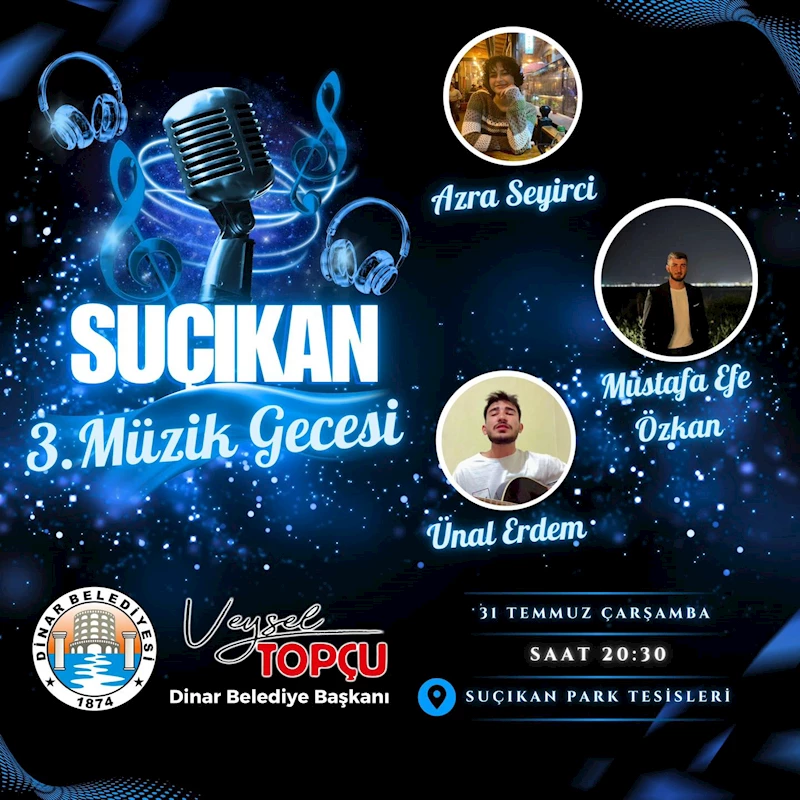 Dinar Belediye Başkanımız Veysel TOPÇU’nun Talimatları Doğrultusunda Düzenlenecek Olan Suçıkan 3. Müzik Gecesi Etkinliğinde ;Azra Seyirci, Mustafa Efe Özkan ve Ünal Erdem Sahne Alacak.